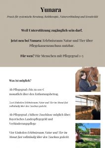 Ab Pflegegrad 2 höhere Zuschüsse möglich über das Bayerische Landespflegegeld und die Verhinderungspflege (entspricht vier Einheiten Erlebnisraum Natur und Tier im Monat fast vollständig über den Zuschuss gedeckt).