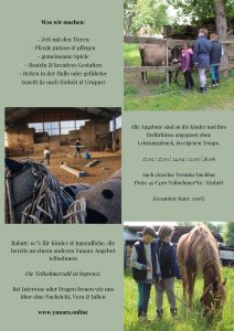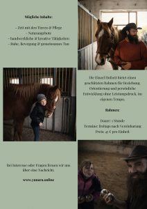 Was dich erwartet: Zeit für dich – draußen, im Jetzt / Begegnung auf Augenhöhe, mit dir selbst, mit anderen und mit Tieren / Erlebnisse, die stärken und verbinden / Impulse zur persönlichen Entwicklung / Raum für Gefühle, Fragen und neue Perspektiven
