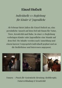 Eine persönliche Auszeit auf dem Hof mit Raum für Natur, Tiere, Kreativität und Ruhe. In einer 1:1 Begleitung verbringen Kinder und Jugendliche eine Stunde auf dem Hof. Die Inhalte werden nach Anmeldung und einem kurzen Vorgespräch individuell geplant und an die Bedürfnisse und Interessen angepasst.