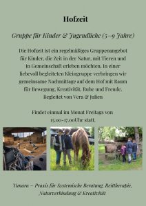 Die Hofzeit ist ein Angebot für Kinder, die Zeit in der Natur, mit Tieren und in Gemeinschaft erleben möchten. In einer liebevoll begleiteten Kleingruppe verbringen wir gemeinsame Nachmittage auf dem Hof mit Raum für Bewegung, Kreativität, Ruhe und Freude.